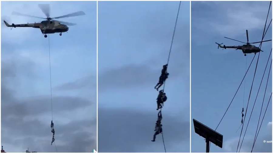 ডিজিটাল ডেস্ক : সহিংসতা কবলিত নেপাল থেকে পাওয়া যাচ্ছে আলোচিত অনেক ছবি ও ভিডিও। এর মধ্যে একটি ভিডিওতে, দেশটির মন্ত্রী এবং তাদের পরিবারের সদস্যদের একটি সেনা হেলিকপ্টার থেকে ফেলা দড়ি (রেসকিউ স্লিং) আঁকড়ে থাকতে দেখা গেছে।
